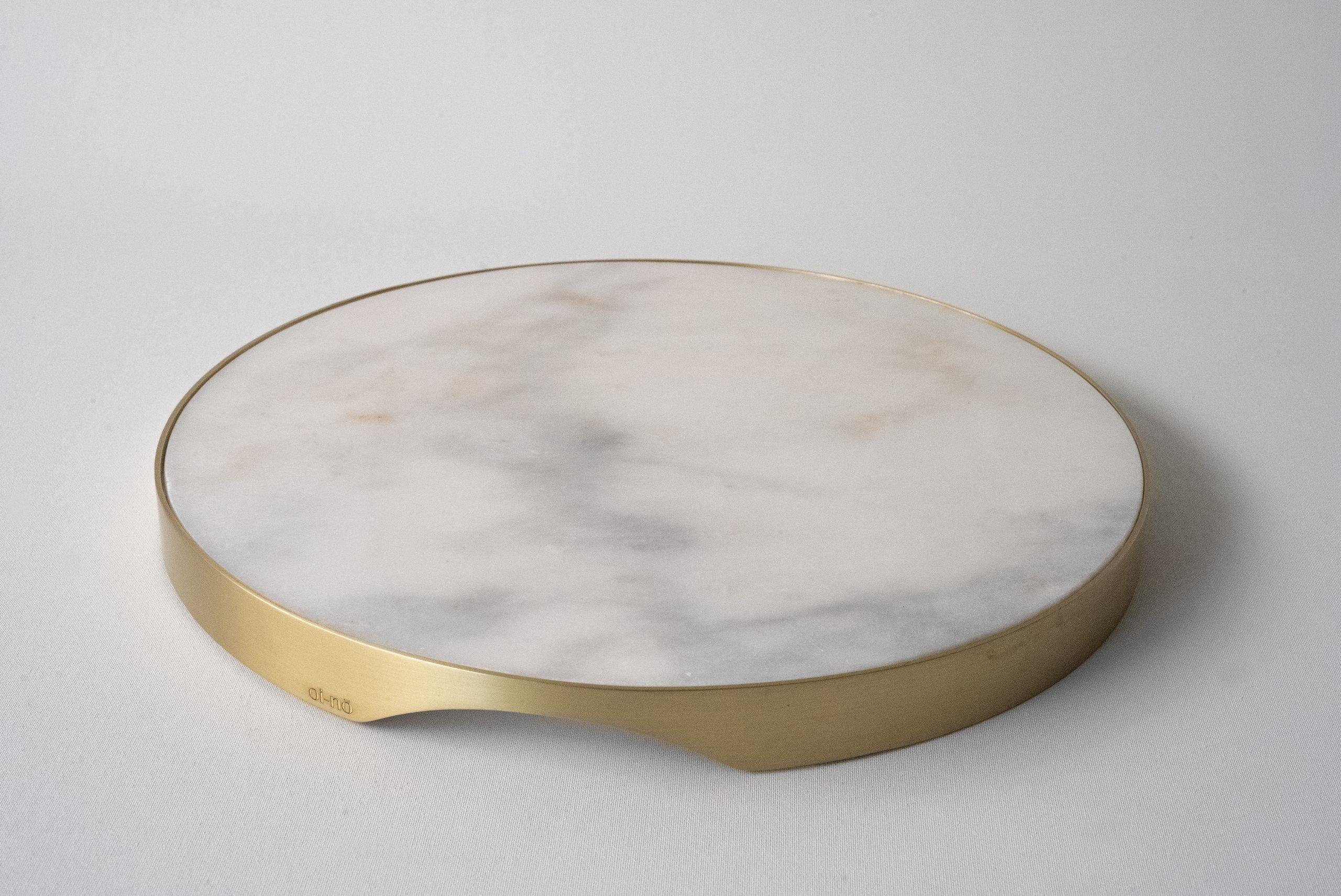 ASAWA Yuvarlak peynir ve şarküteri tepsisi doğal rengi ve eşsiz damarlı yapısı ile en iyi peynir ve şarküteri çeşitlerinizi sergilemenin şık ve sofistike bir yolunu sunar. Pirinç çerçevenin iki tarafındaki oyuklar peynir tabağını kaldırmak için kolay bir yol sağlarken, çerçevenin zeminine oturan el üretimi doğal taş çeşitleri göz alıcı bir tasarım ortaya koyar. Doğal hali ile soğuk olan mermer ya da traverten ısıyı peynir ve şarküterilerden uzaklaştırarak atıştırmalıkların fazla ısınmasını önler ve taze kalmasını destekler.