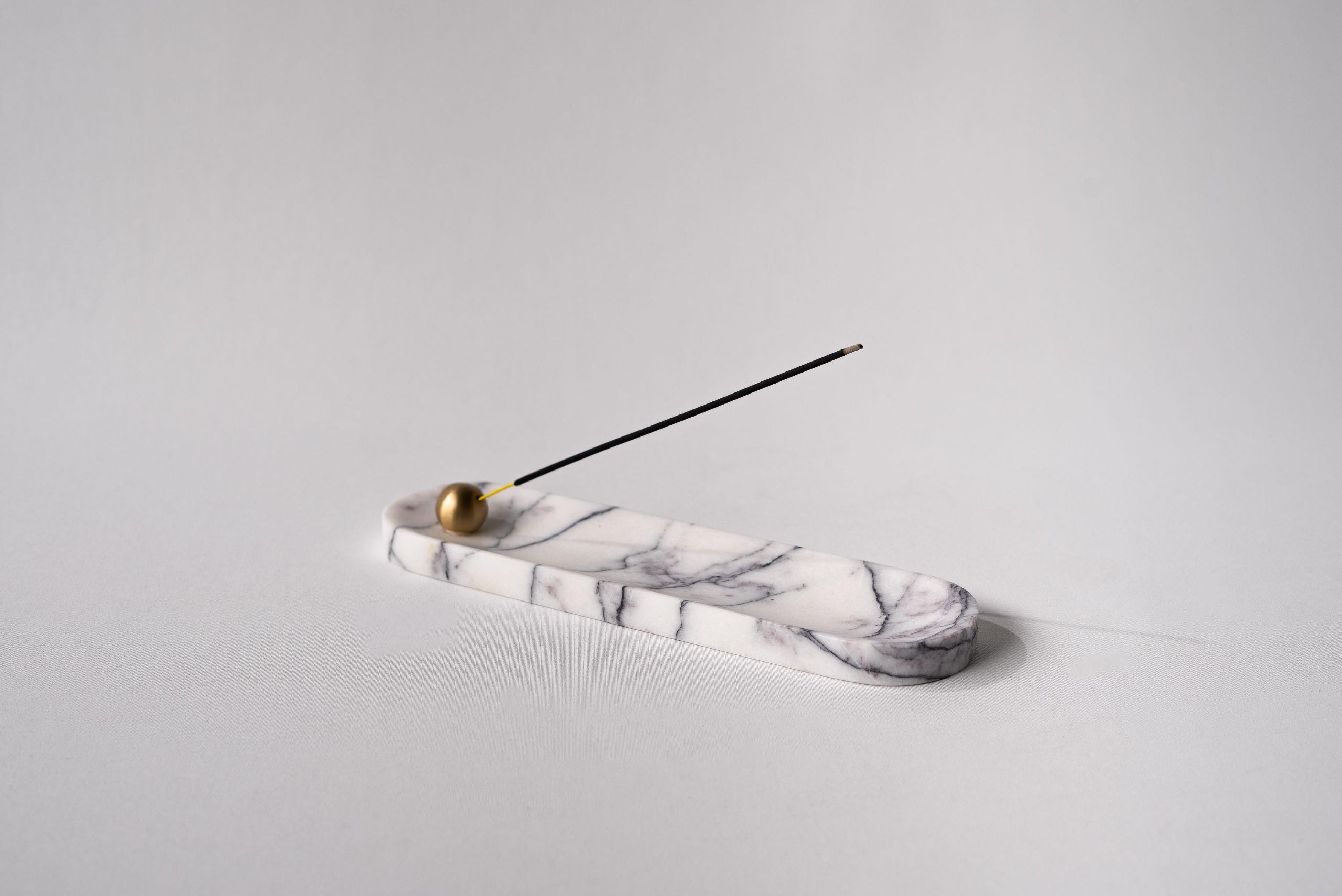 Riley Uzun Tütsülük siyah, leylak mermer ve traverten renklerinde mevcut olup, zarafeti ve sadeliği dengeleyen şık bir tasarıma sahiptir. Mermer temel ile birleştirilmiş olan pirinç küre tütsü tutucusu, tütsüyü mükemmel açıda yakmak için özel olarak tasarlanmış olup, tütsünün sakinleştirici aromasının nazikçe yayılmasına olanak tanır. Minimalist ancak dikkat çekici tasarımı, yerleştirildiği her yerde sıcak ve sakinleştirici bir atmosfer yaratarak her türlü ev dekoruna ve mekana uyum sağlar.